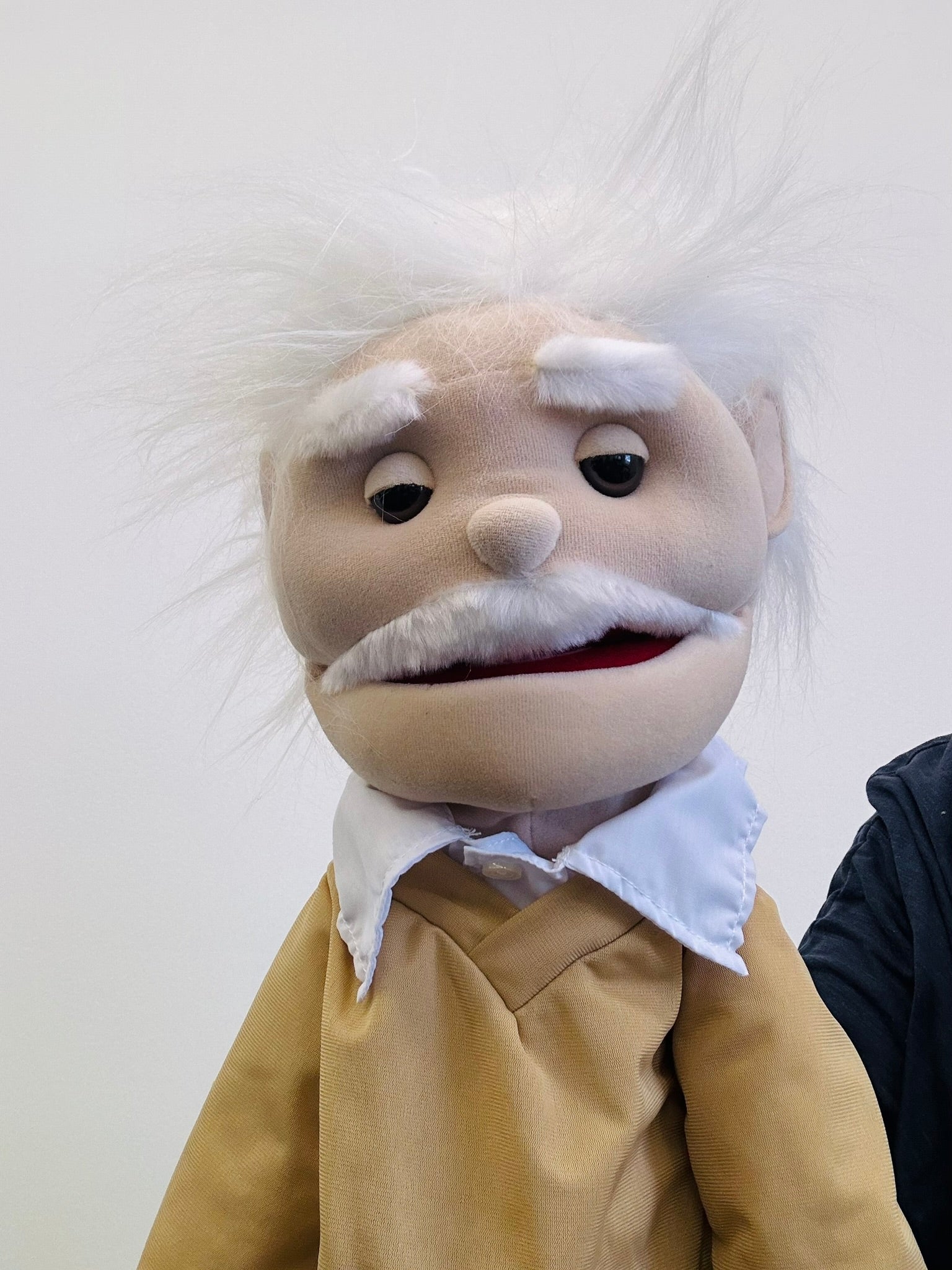This Sunny Toys 28" Einstein puppet comes completely outfitted as shown in tan pants and sweater with white color (clothing may vary slightly due to fabric availability).