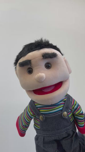 This 14” Hispanic Boy puppet is fun! The boy puppet is completely dressed in a striped shirt with matching socks, adorable denim overalls, and a pair of red and white tennis shoes. (clothing may vary slightly due to fabric availability).