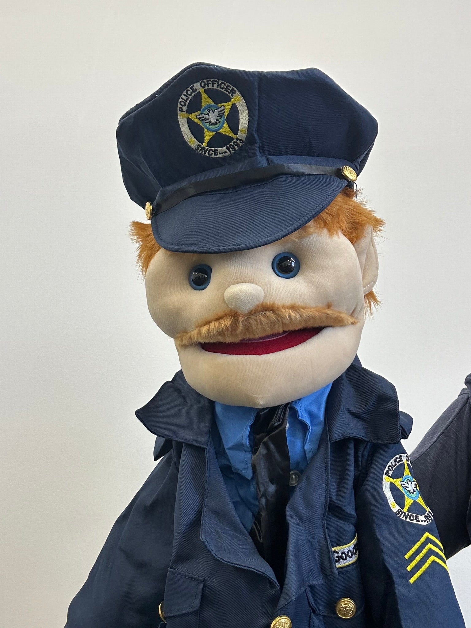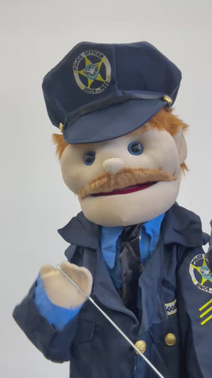 This 28” Policeman Goodman puppet is simply magical. He's wearing a police uniform and cap. Finishing off his look are a black top hat and shoes. (clothing may vary slightly due to fabric availability). His hat is held on by a couple of stitches, his clothes are removable and he wears child size 2T clothing.